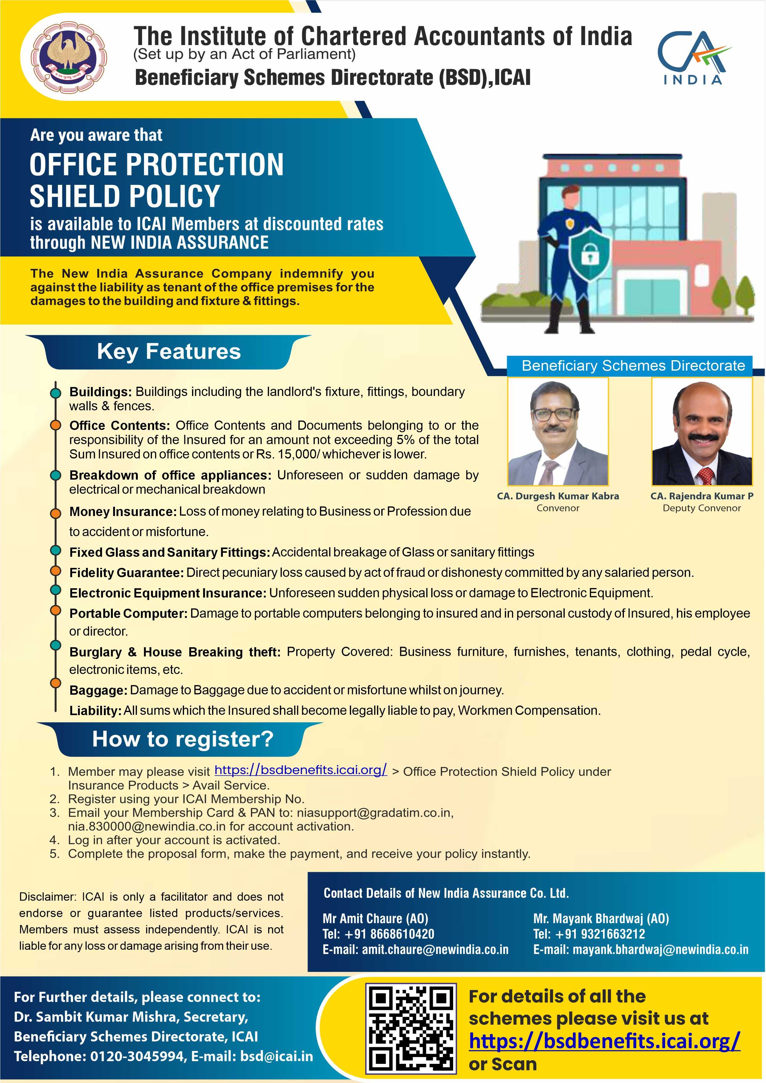 The ICAI Office Protection Shield Insurance Scheme is a specialized policy designed for members and their firms. This policy provides comprehensive coverage for office premises, including protection against fire, burglary, money in transit, and damage to electronic equipment. It aims to safeguard the professional workspace of Chartered Accountants against unforeseen events.