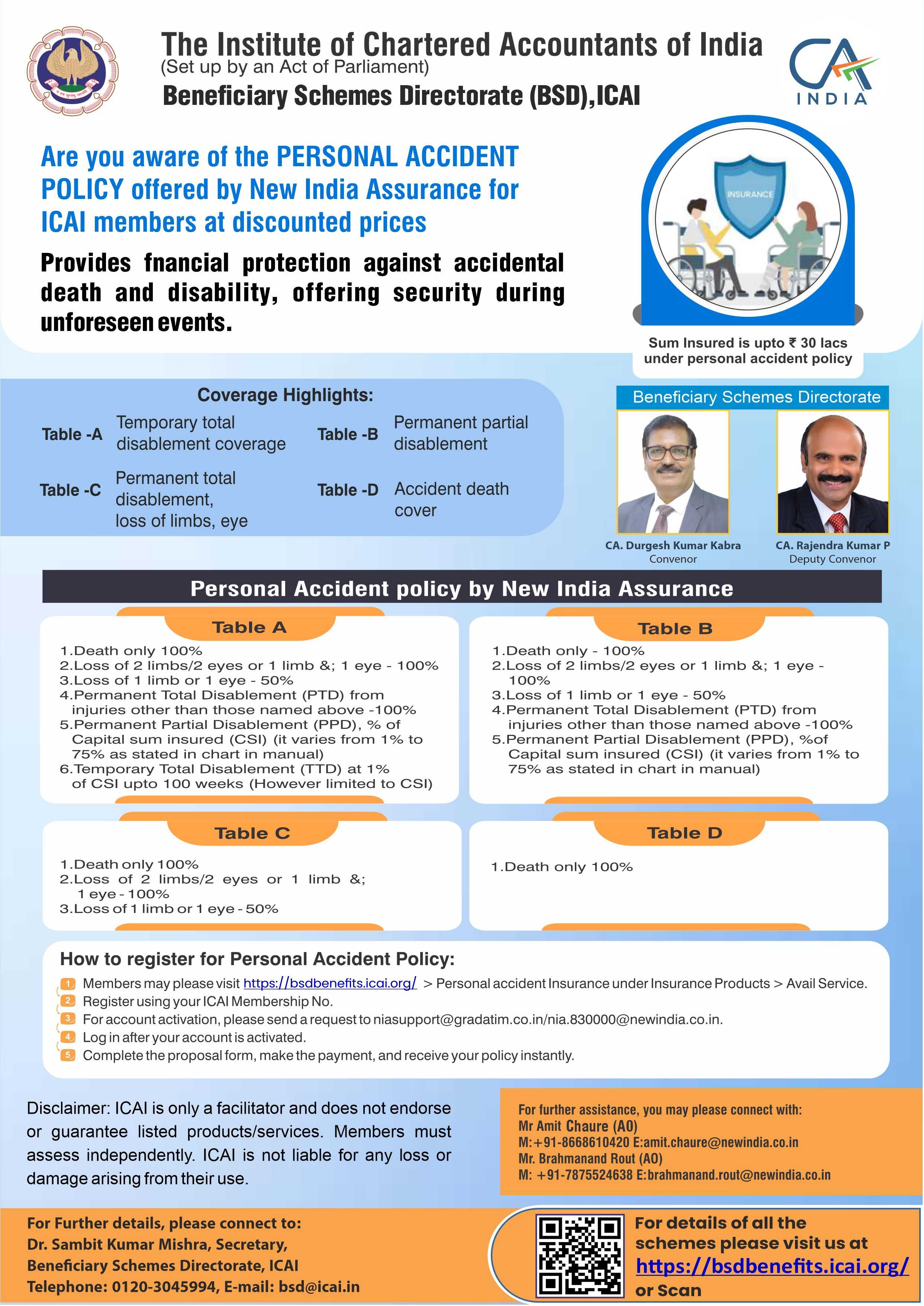 Personal Accident Insurance policy by NIA provides coverage for members of ICAI. This policy offers compensation in the event of accidental death, permanent total disability, loss of limbs, and permanent partial disability. It also includes reimbursement for hospitalization expenses resulting from accidents. The scheme is designed to offer financial protection against unforeseen accidents.